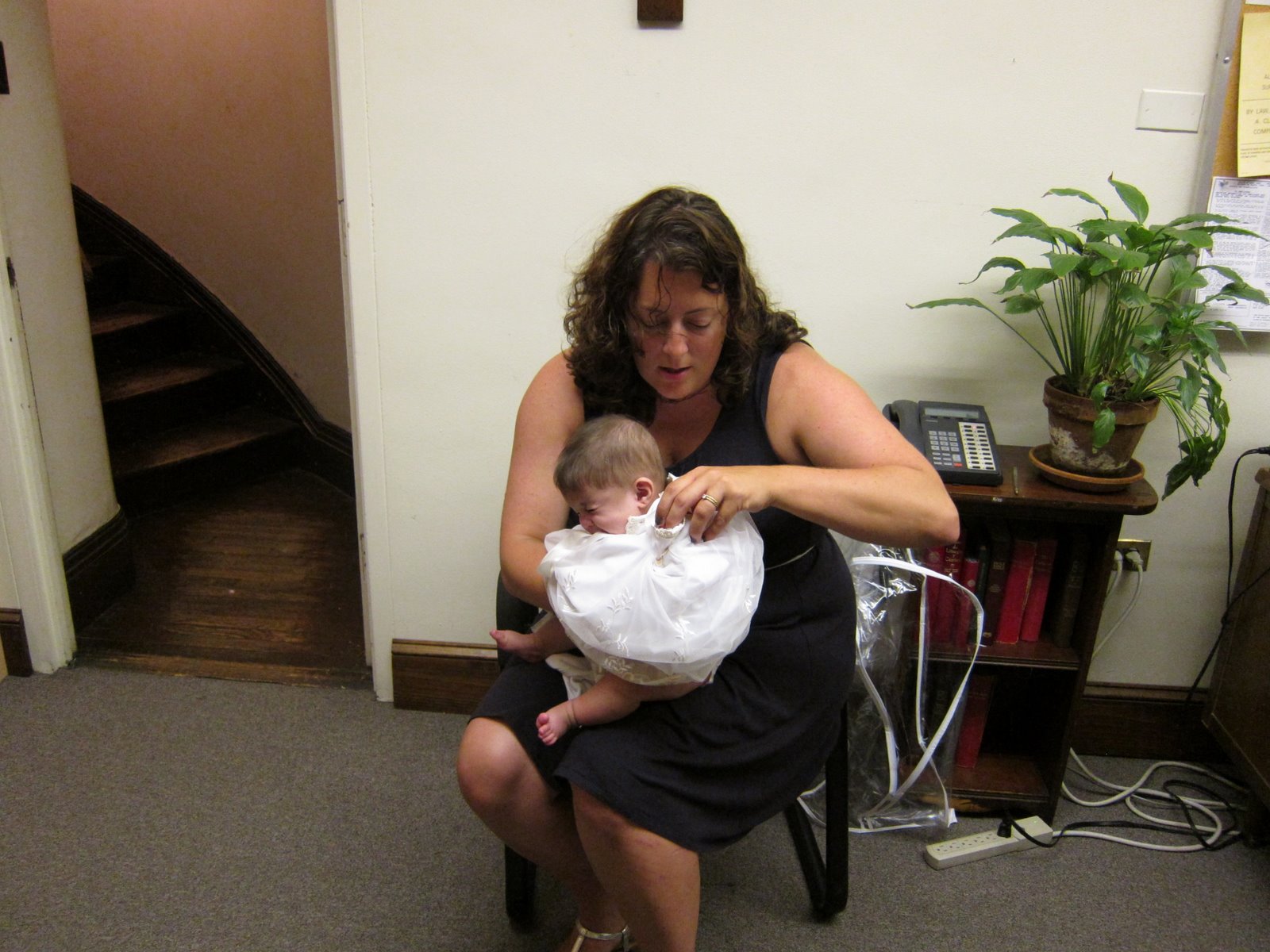 The girls got christened this morning at Holy Trinity. Their godmothers Lauren (above) and Monica (below) wrangled them into their fancy gowns.